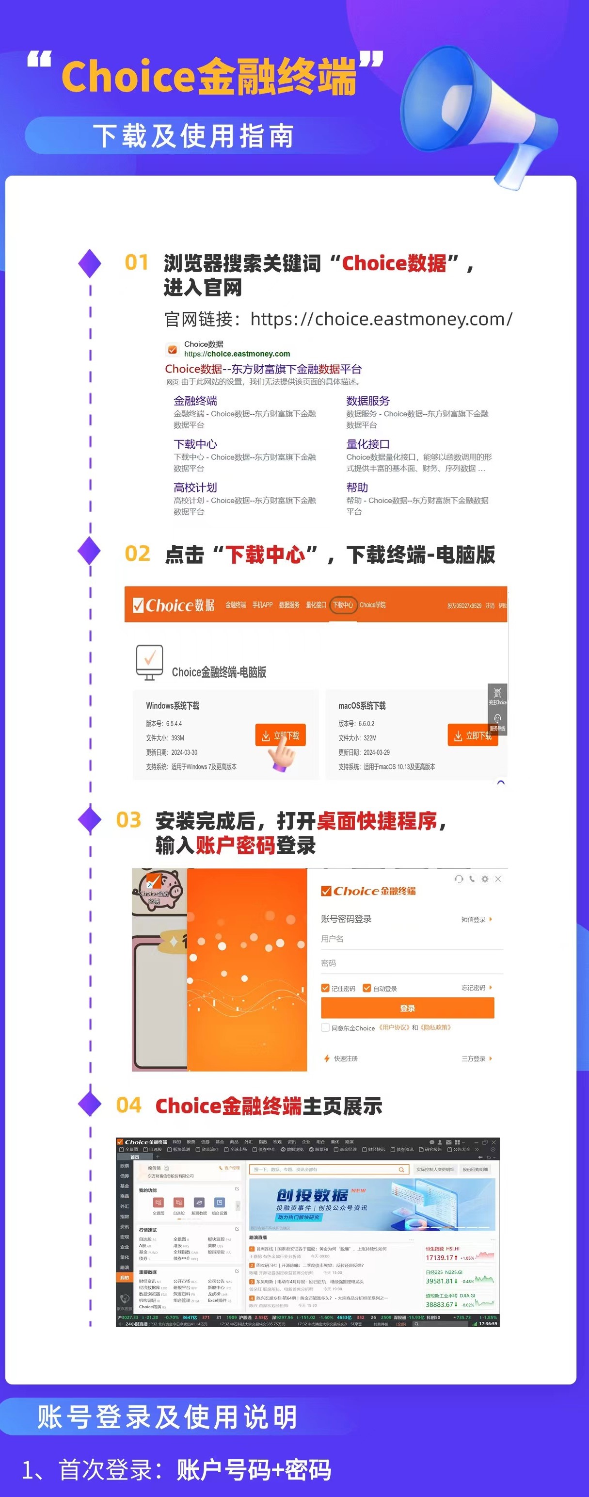 学院已正式采购东方财富旗下专业的金融数据分析与投资管理软件Choice金融终端集群版,供全院师生教学科研使用,现将相关访问方式和数据库介绍如下,欢迎大家积极按需使用,有效期2025年1月1日——2025年12月30日。