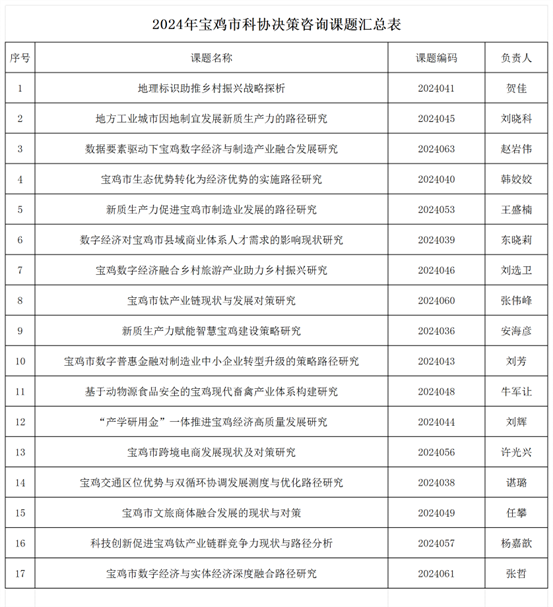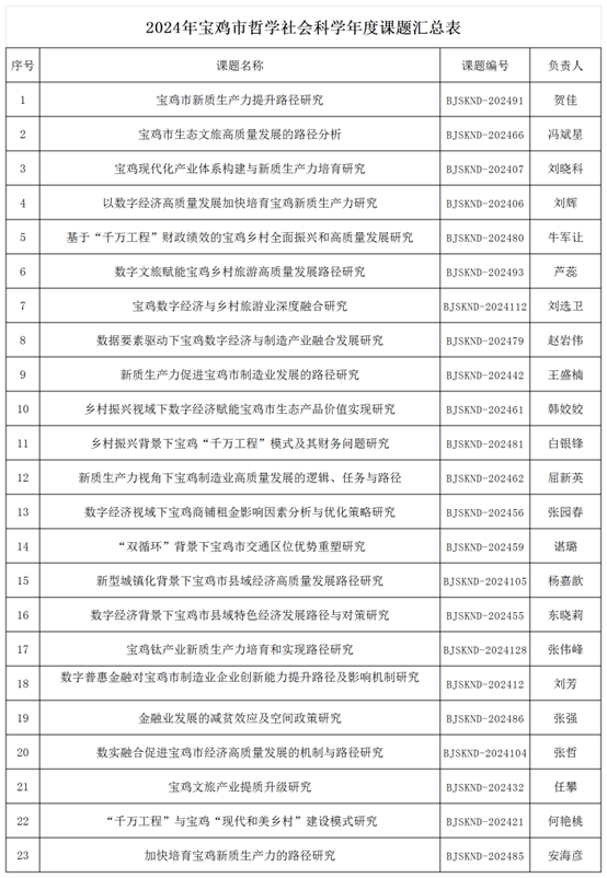 宝鸡市哲学社会科学工作领导小组办公室公布2024年宝鸡市哲学社会科学专项课题立项名单共132项,我院教师共获批23项。5月6日宝鸡市科学技术协会工作领导小组办公室公布了2024年宝鸡市科协决策咨询调研课题立项名单共计159项,我院教师共获批17项。( 文/周庆怡 审核/刘辉)