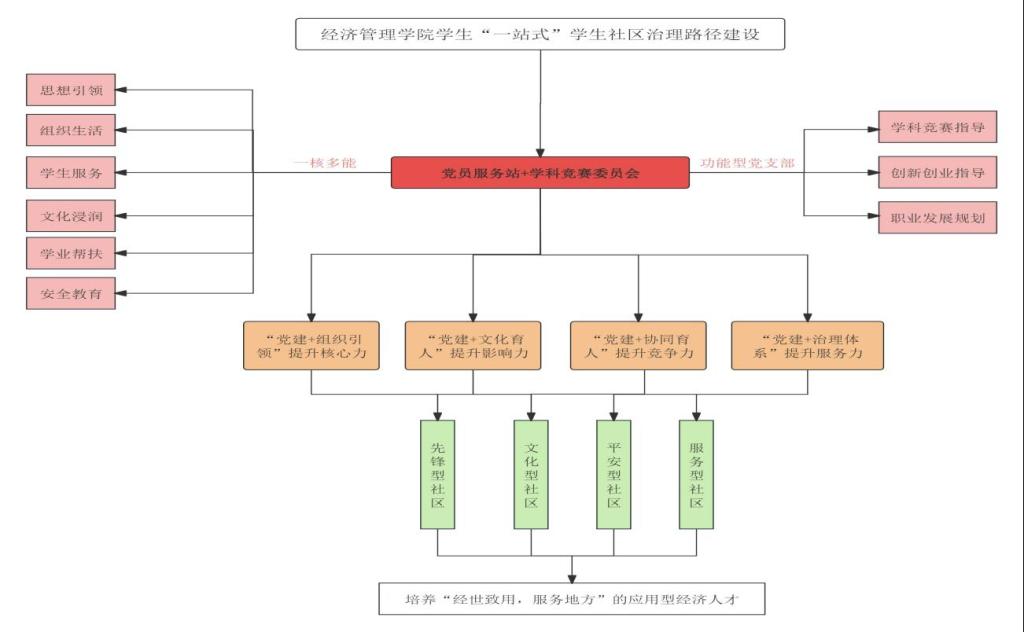 以经管学院人才培养为起点,发挥样板支部示范引领作用,探索构建“一核多能”社区治理体系。将样板支部培育建设与强化“一站式”学生社区综合管理模式建设协调推进,形成以“一站式”服务中心为纽带,依托“启心育人”党员服务站和学科竞赛委员会组织,辐射六个学生社区等多种延伸功能,推动党建引领“一站式”学生社区服务的“红色引擎”,充分发挥专家学者、思政教师、师生党员在思想引领、学风建设、精神文明建设、校园文化建设和社区管理中的先锋模范作用,致力于打造集思想教育、师生交流、文化活动、生活服务于一体的育人新平台,助推学院“一站式”社区建设提质增效。