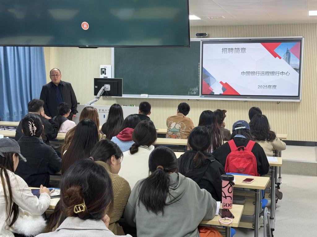 10月29日下午,中国银行远程银行中心校园招聘宣讲会在太阳成tyc9728集团高新校区思贤楼101教室举行。本场活动由9728太阳集团组织,学院100余名毕业生踊跃参加。辅导员贾宇阳、耿天城全程参与。