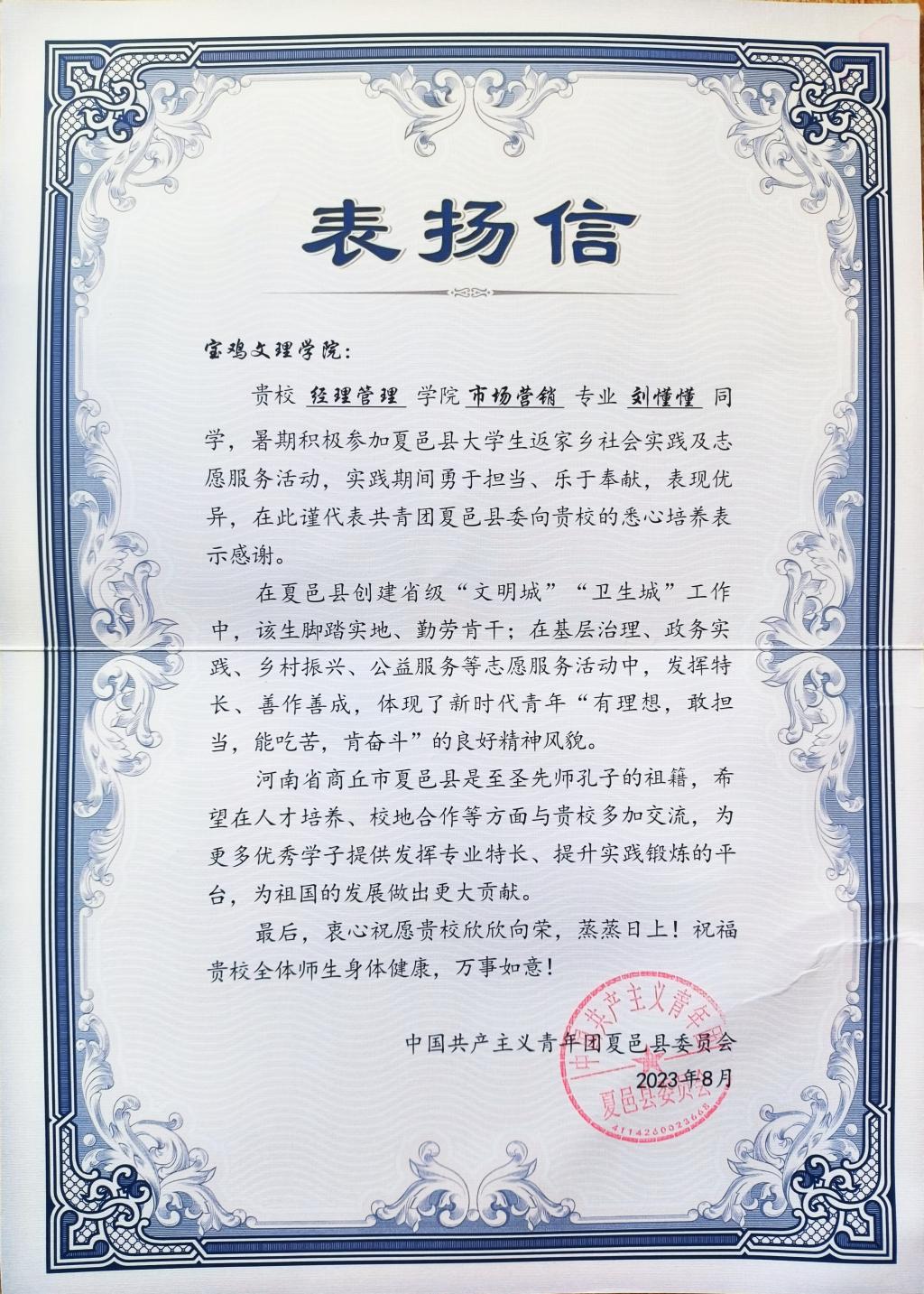 近日,我院收到来自共青团河南省商丘市夏邑县委的表扬信。信中对我院2022级市场营销专业刘懂懂同学参加夏邑县返家乡社会实践及志愿服务活动给予了充分肯定。