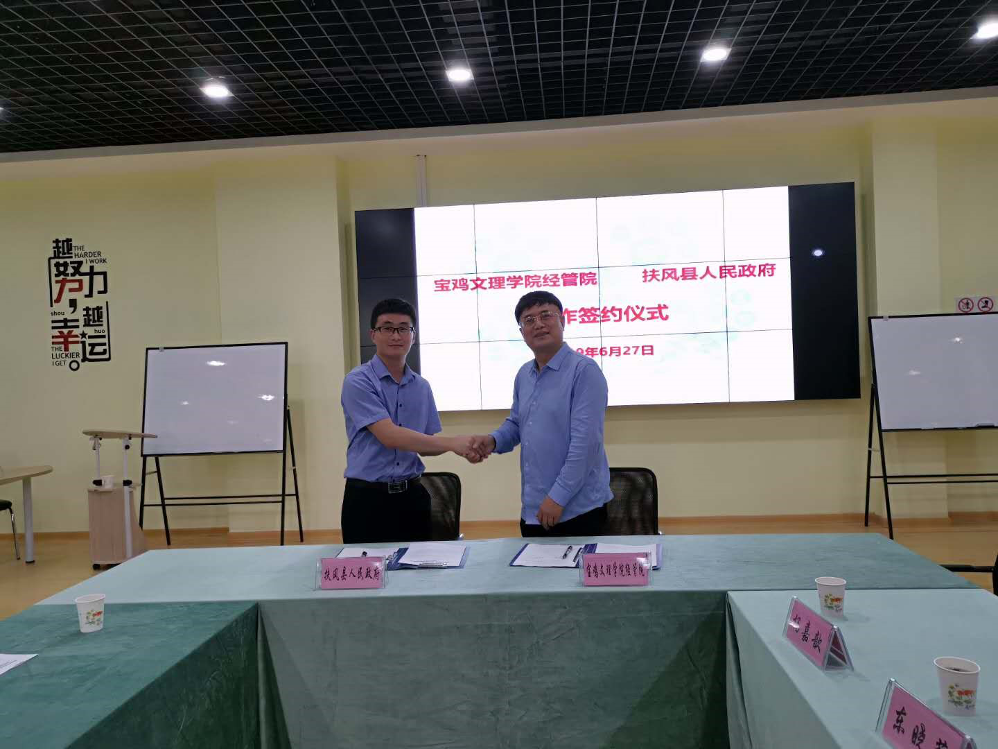 6月27日,我院与扶风县人民政府在我校尚能楼创新创业实验室举行电子商务校地合作协议签署仪式。宝鸡市商务局副局长李小平、扶风县人民政府副县长赵炳震、扶风县电子商务服务中心王丽娟、我院院长张伟峰、副院长刘晓科、工商管理系主任郑蕾以及部分教师代表参加签约仪式。仪式由学院副院长刘辉主持。