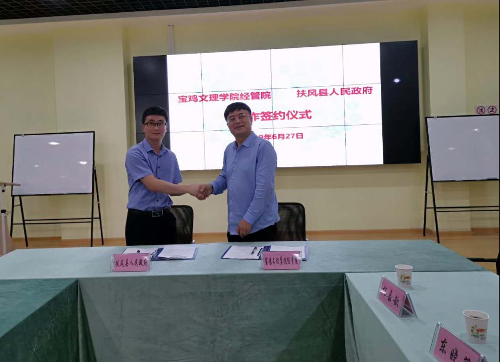 6月27日,我院与扶风县人民政府在我校尚能楼创新创业实验室举行电子商务校地合作协议签署仪式。宝鸡市商务局副局长李小平、扶风县人民政府副县长赵炳震、扶风县电子商务服务中心王丽娟、院长张伟峰、副院长刘晓科、工商管理系主任郑蕾以及部分教师代表参加签约仪式。仪式由9728太阳集团副院长刘辉主持。